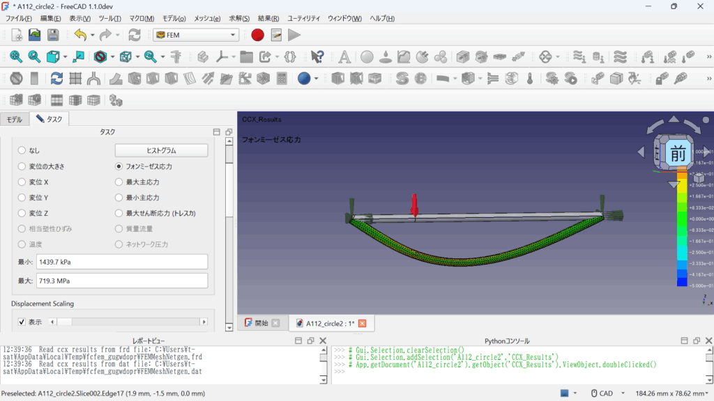 | 最大曲げ応力 | 707.36 MPa | 719.3 MPa(ミーゼス) |